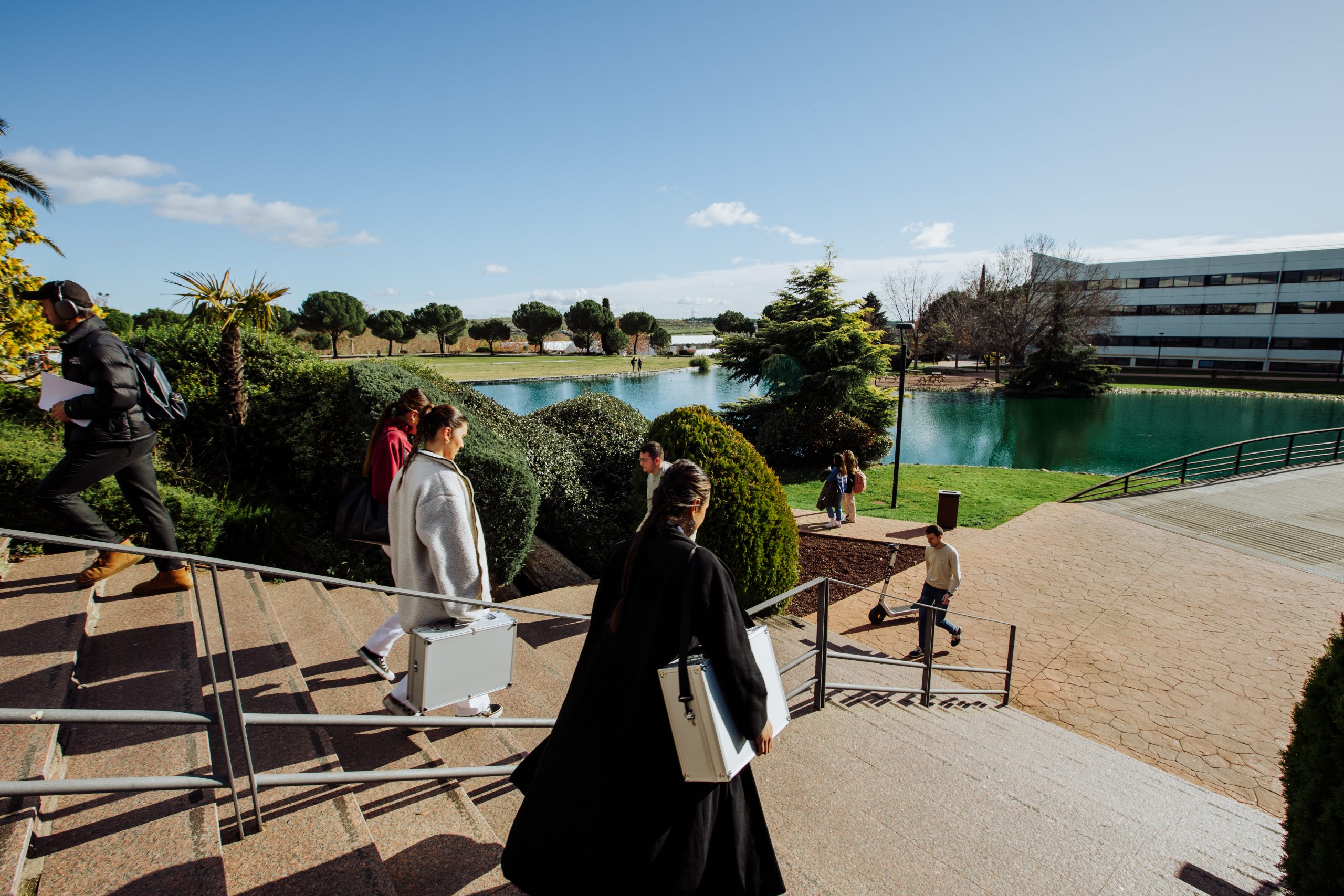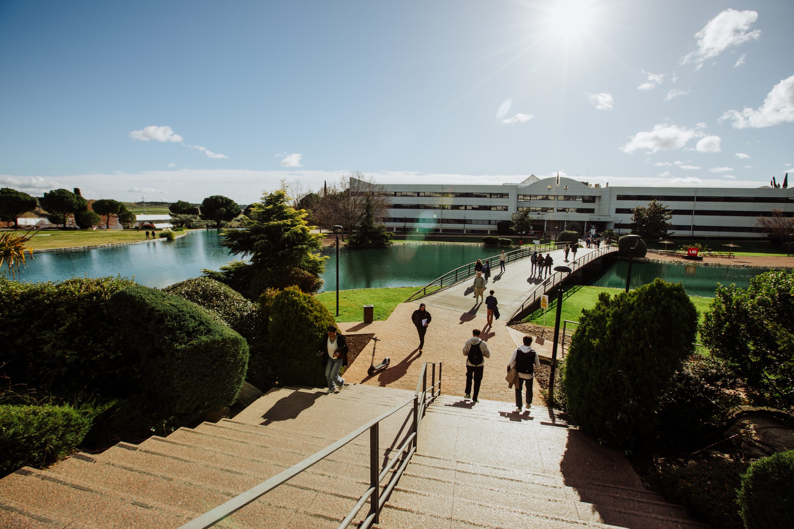Hay aparcamientos habilitados para estudiantes dentro del campus. Si vienes desde el centro de Madrid, el trayecto en coche suele durar entre 25 y 40 minutos, dependiendo del tráfico.